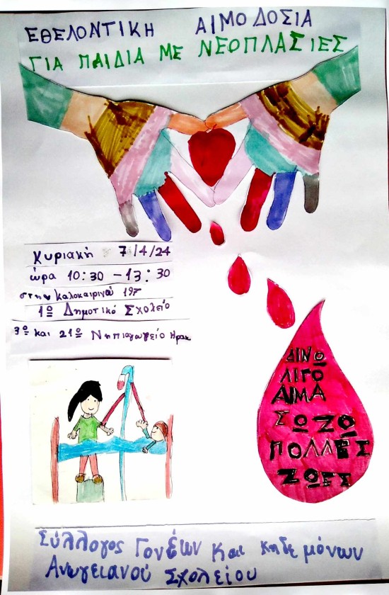 Εθελοντική αιμοδοσία για παιδιά με νεοπλασίες Κυριακή 7 Απριλίου 2024 Ώρα: 10:30 – 13:30Τοποθεσία : Στον προαύλιο χώρο του 1ου Δημοτικού σχολείου Ηρακλείου, 3ου & 21ου Νηπιαγωγείου “Ανωγειανο” στην Λ.Καλοκαιρινού 197