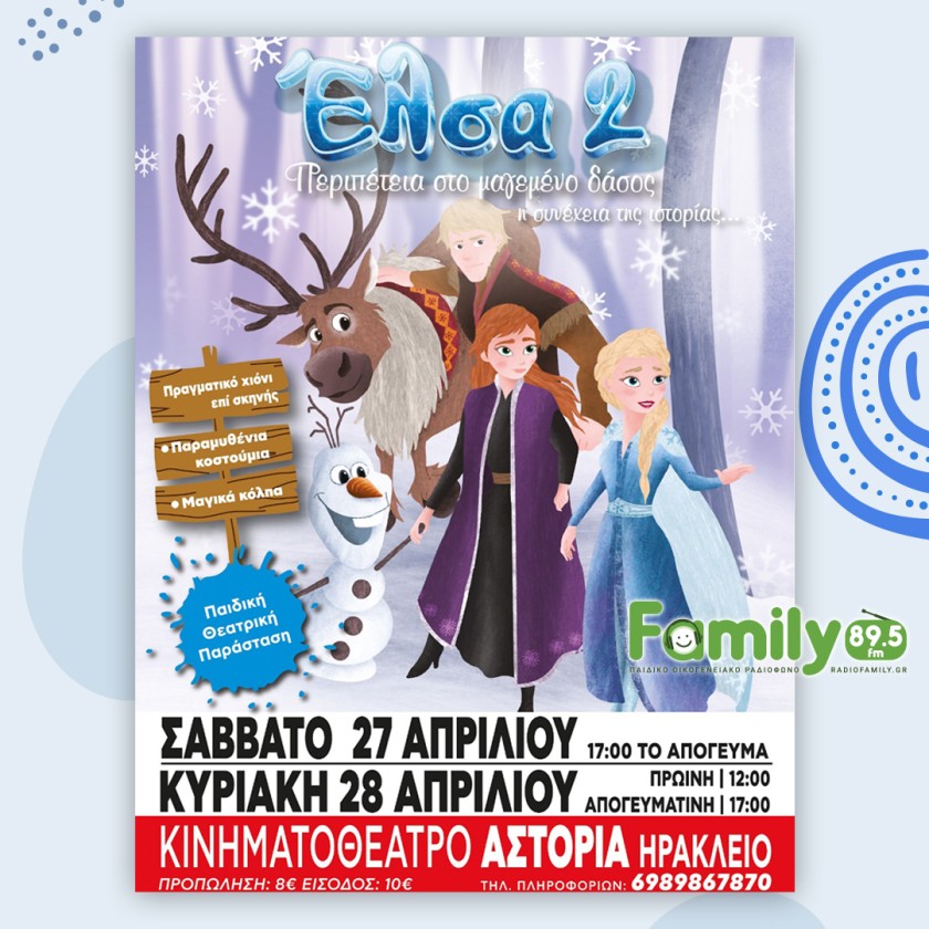 Μια επική περιπέτεια με πρωταγωνιστές την Έλσα , την Άννα , τον χιονάνθρωπο Όλαφ και τον τάρανδο Σβεν έρχεται στο Ηράκλειο το Σάββατο 27 Απριλίου στις 17.00 και την Κυριακή 28 Απριλίου στις 12.00 & στις 17.00 στο Κινηματοθέατρο ΑΣΤΟΡΙΑ.