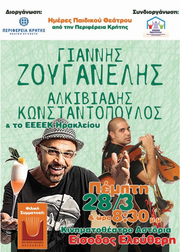 Με αφορμή την Παγκόσμια Ημέρα Θεάτρου για Παιδιά και Νέους που εορτάζεται στις 20 Μαρτίου και στο πλαίσιο των δράσεων «Ημέρες Παιδικού Θεάτρου», η Περιφέρεια Κρήτης διοργανώνει με την υποστήριξη του Ε.Ε.Ε.Ε.Κ. Ηρακλείου (Εργαστήριο Ειδικής Επαγγελματικής Εκπαίδευσης και Κατάρτισης Β/θμιας εκπαίδευσης) μουσικοθεατρική παράσταση με τον Γιάννη Ζουγανέλη και τον Αλκιβιάδη Κωνσταντόπουλο.