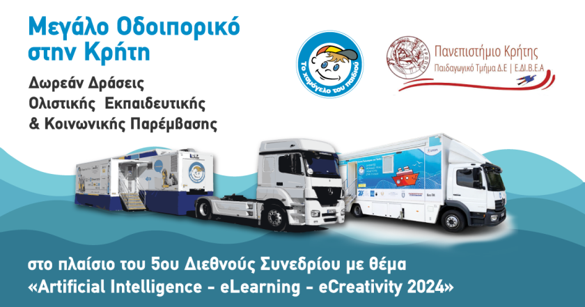 Το Οδοιπορικό Δωρεάν Δράσεων Ολιστικής Εκπαιδευτικής και Κοινωνικής Παρέμβασης, το οποίο είχε προανακοινωθεί τον Νοέμβριο κατά την ημέρα υπογραφής του Συμφώνου Συνεργασίας μεταξύ του Πανεπιστημίου Κρήτης και του Οργανισμού «Το Χαμόγελο του Παιδιού», μετρά ήδη 7 σταθμούς (Κέα, Κορωπί Αττικής, Καλαμάτα, Κεντρική Εύβοια, Κεντρική Μακεδονία, Ανατολική Μακεδονία-Θράκη και Λάρισα), κι έρχεται στην Κρήτη εορταστικά, στο πλαίσιο του 5ου Διεθνούς Συνεδρίου με θέμα «Artificial Intelligence -eLearning – eCreativity 2024», για να τιμήσει τον τόπο όπου γεννήθηκε η ιδέα να συμπράξουν οι δύο φορείς, με κοινό στόχο την αξιοποίηση στο μέγιστο των δράσεων, της τεχνογνωσίας και της εμπειρίας που έχει αναπτύξει «Το Χαμόγελο του Παιδιού» με τα στελέχη του, τα 28 χρόνια δράσης τους, για την προστασία κάθε παιδιού και κάθε οικογένειας στη χώρα μας.