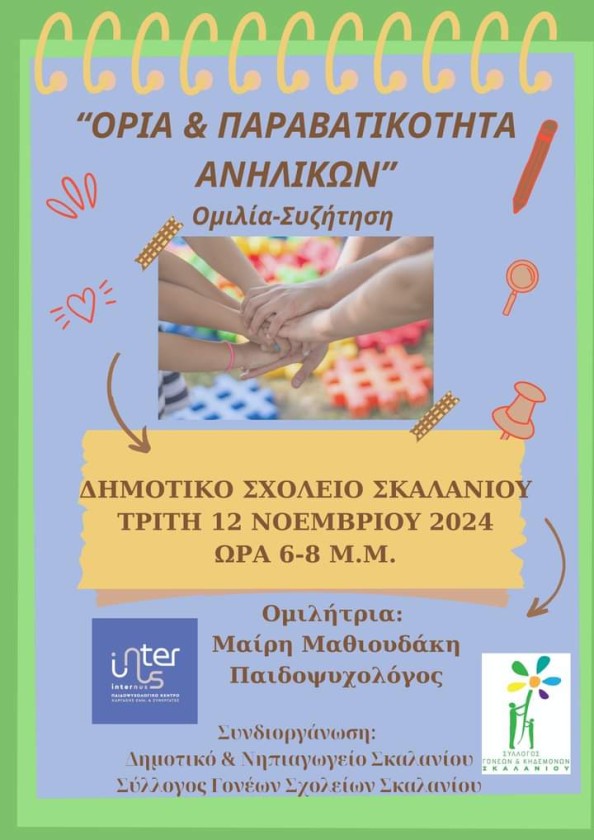Όρια & Παραβατικότητα ανηλίκωνΟμιλία – Συζήτηση Δημοτικό σχολείο Σκαλανίου – Τρίτη 12 Νοεμβρίου 2024 – Ώρα 6-8 μ.μ. Ομιλήτρια Μαθιουδάκη Μαίρη Παιδοψυχολόγος ΣυνδιοργάνωσηΔημοτικό & Νηπιαγωγείο ΣκαλανίουΣύλλογος Γονέων Σχολείων Σκαλανίου