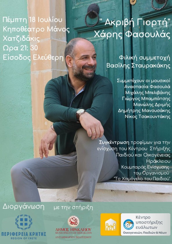 Σας προσκαλούμε στη μεγάλη συναυλία Κρητικής Μουσικής με τον Χάρη Φασουλά και την ευγενική φιλική συμμετοχή του Βασίλη Σταυρακάκη.